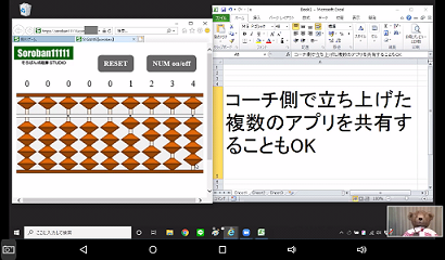 当教室が提供する電子そろばん(無料)と併用するとこのような画面を生徒と共有できます。